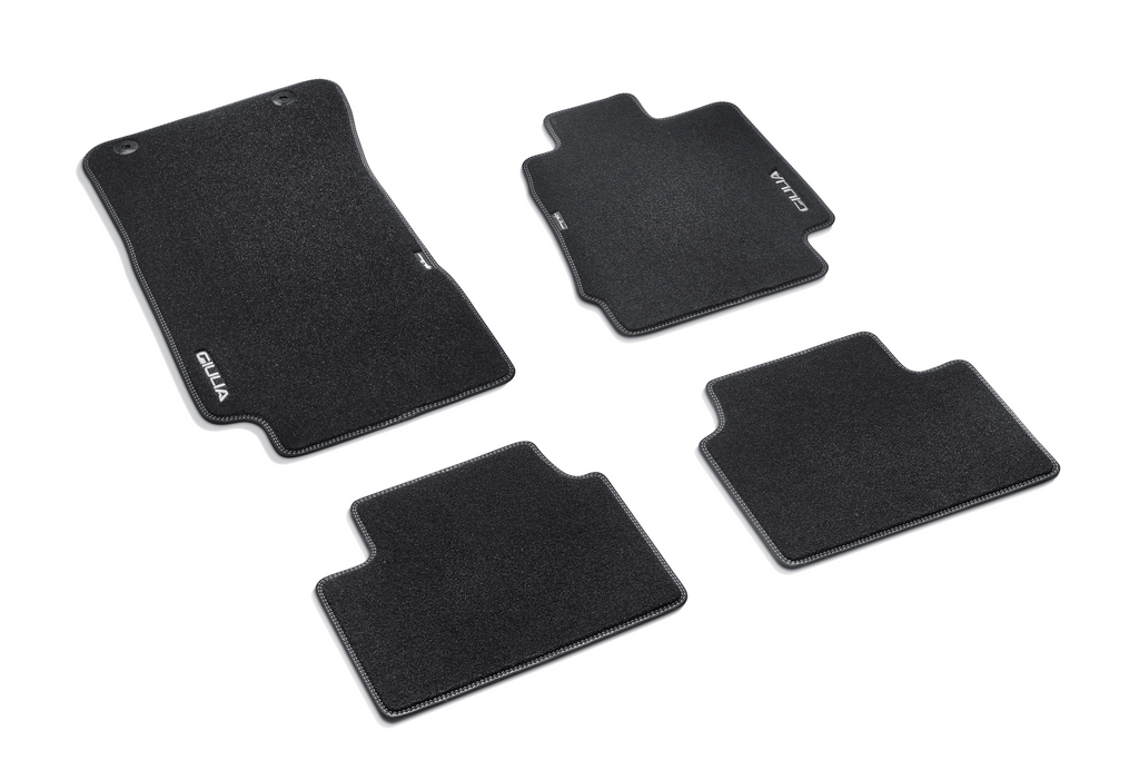 Set of four (2x front, 2x rear) floor mats in black color with white embroidered Giulia naming on driver and passenger side. With a two-pin security system.