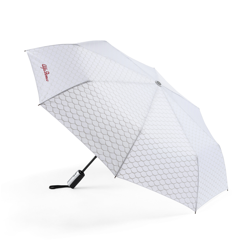 Automatic opening and closing with a resin handle and 98cm diameter to provide ample coverage in any weather conditions. The distinctive hexagon pattern on the canopy recalls the grill of the Giulia and Stelvio.