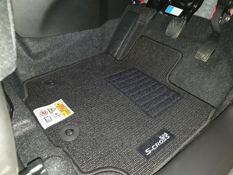 Combination Floor Carpet Matt Set of 6mm black and 4mm gray loop piles with rayon emblem SX4 logo.