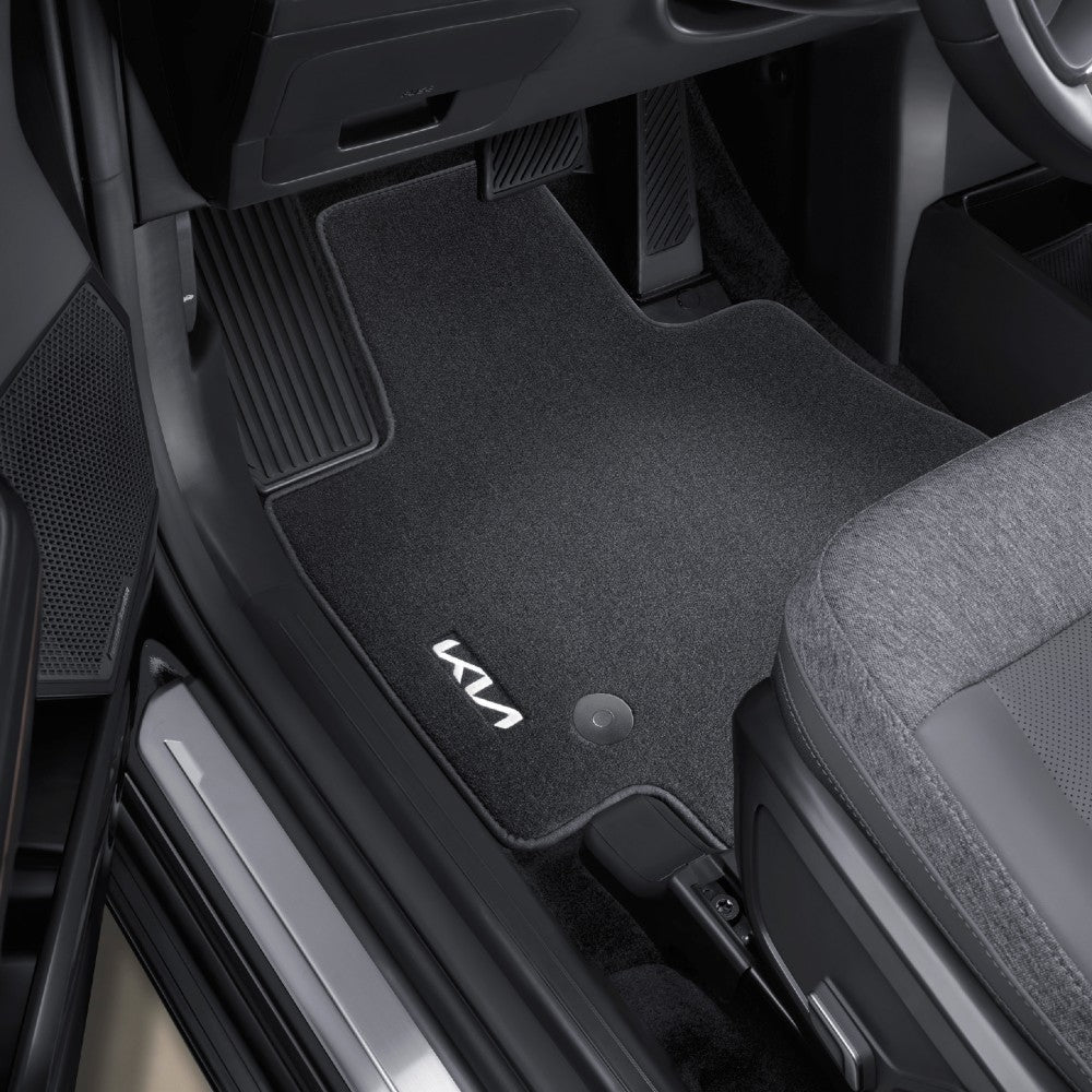 Keep your cabin looking fresh for longer with these Genuine Kia textile velour floor mats made from ECONYL® (RHD). Designed to fit the footwells precisely, they protect your interior from everyday dirt while adding a premium finish. Featuring an embroidered Kia logo in the front row, anti-slip backing, and standard fixing points, they stay securely in place for daily use. Reference image.