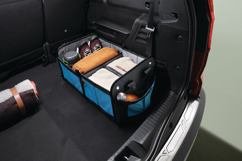 Compartmentalized storage box for trunk organization. This foldable container allows for versatile storage of various items.