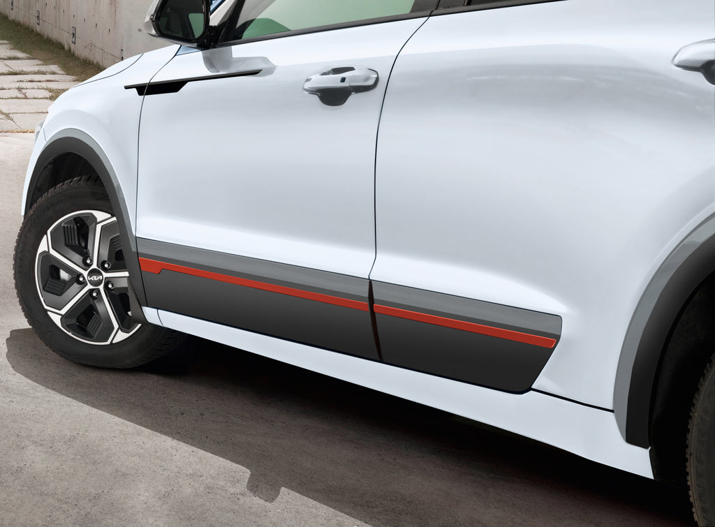 Overview: Elevate the side profile of your 2022 and onwards Kia Niro with these Orange Delight mouldings. Tailored for the HEV, PHEV, and EV variants, they impart a unique, refined touch to your vehicle's contours.