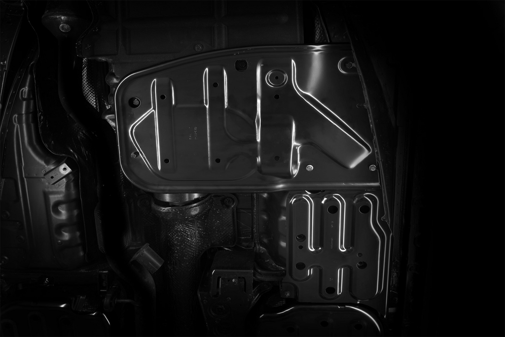 Transfer case skid plate, same as production, protects transfer case and tubing bundle, includes fasteners. Gas engines only.